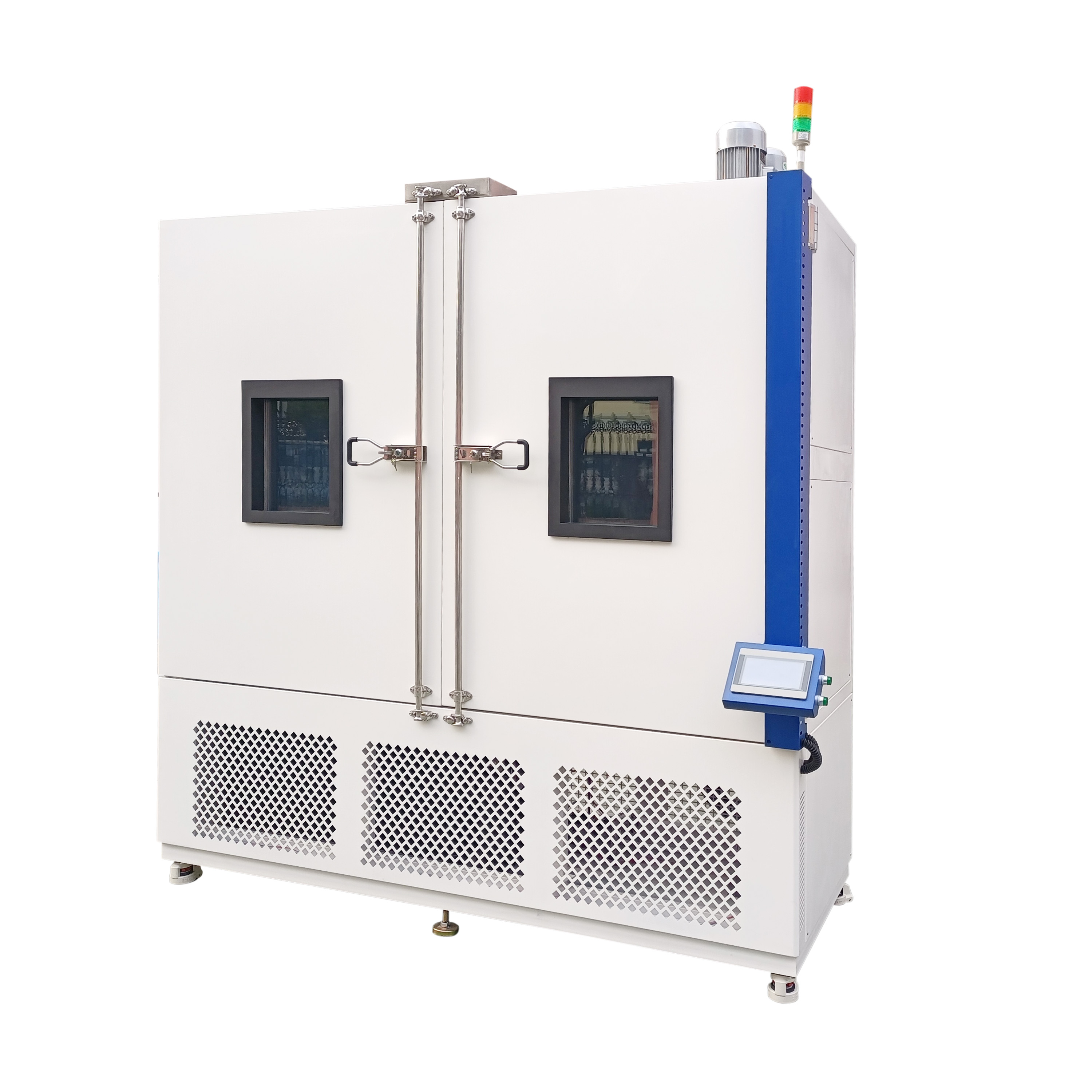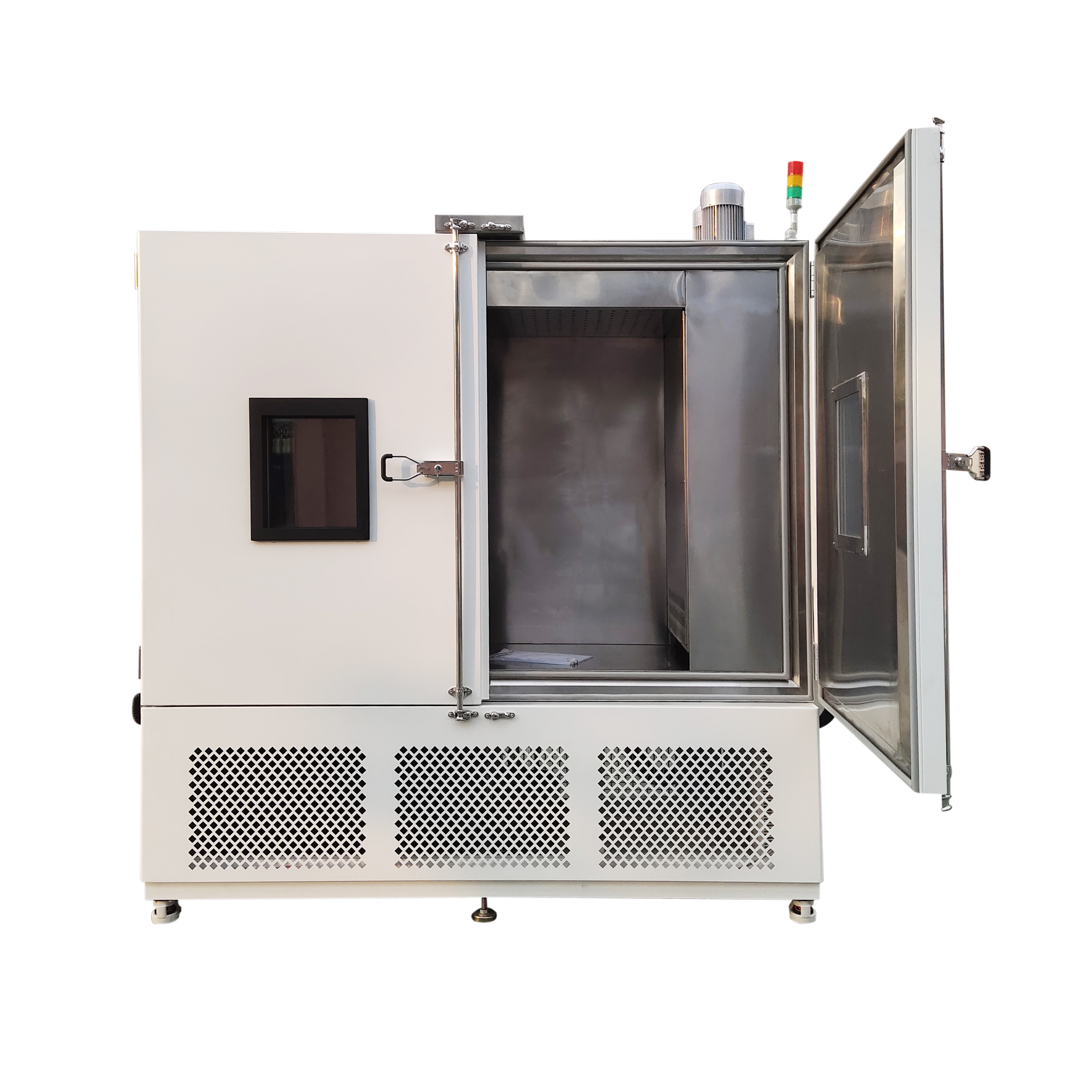 1、試驗(yàn)箱箱門為雙開拉式大門,門上設(shè)有玻璃觀察窗,觀察窗由 中空鋼化玻璃制成,有電熱除霜功能。
