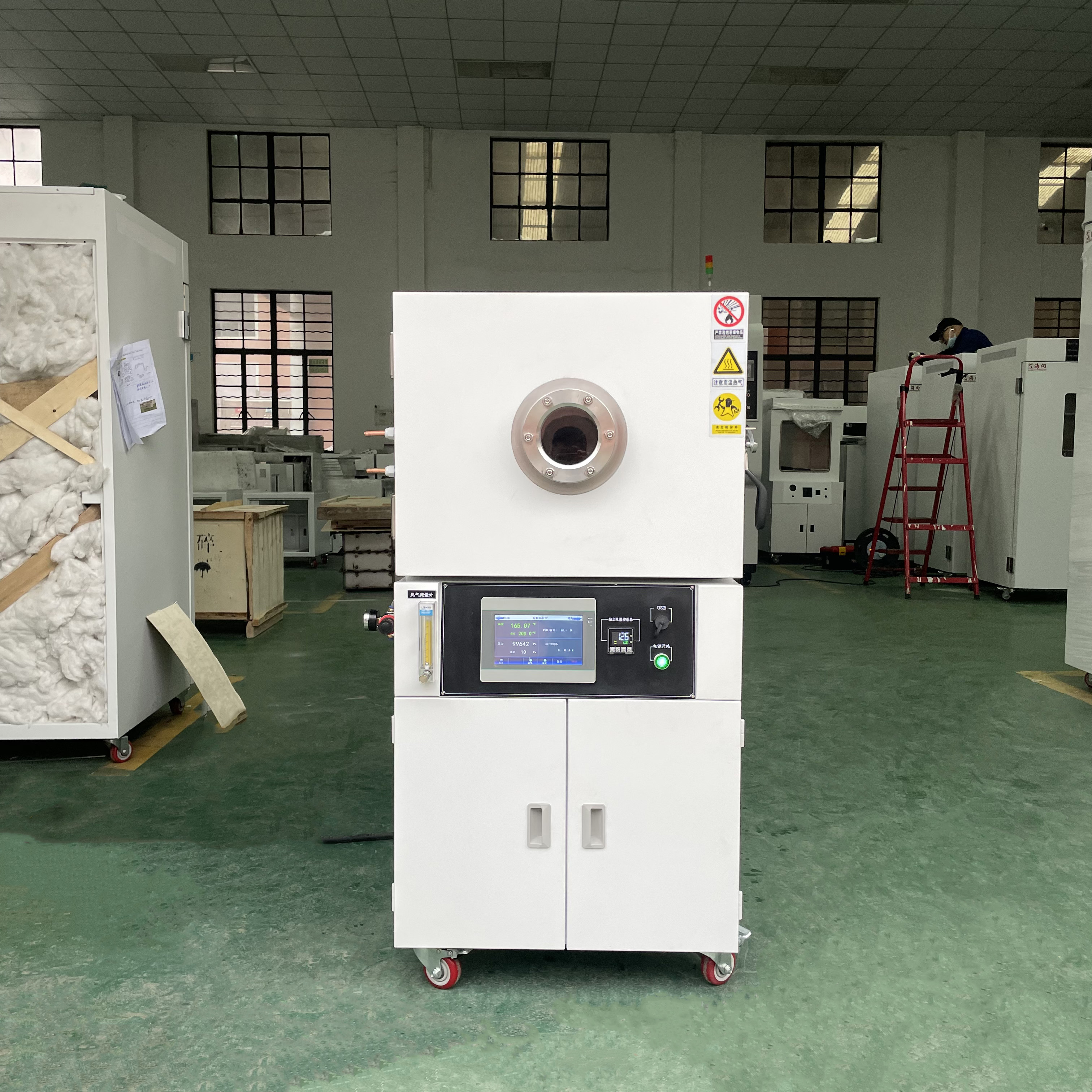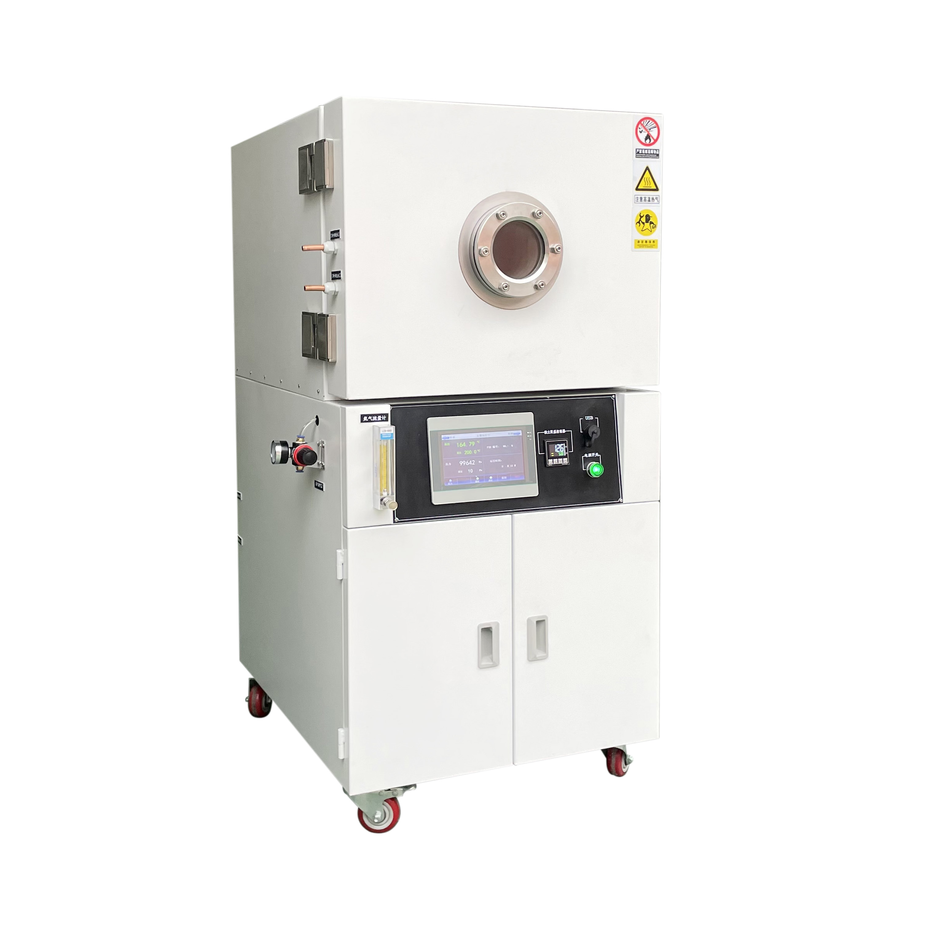 8. 立式結(jié)構(gòu),上部為腔體工作室,儀表中部,真空泵放在下部下箱柜,門上有圓形視窗